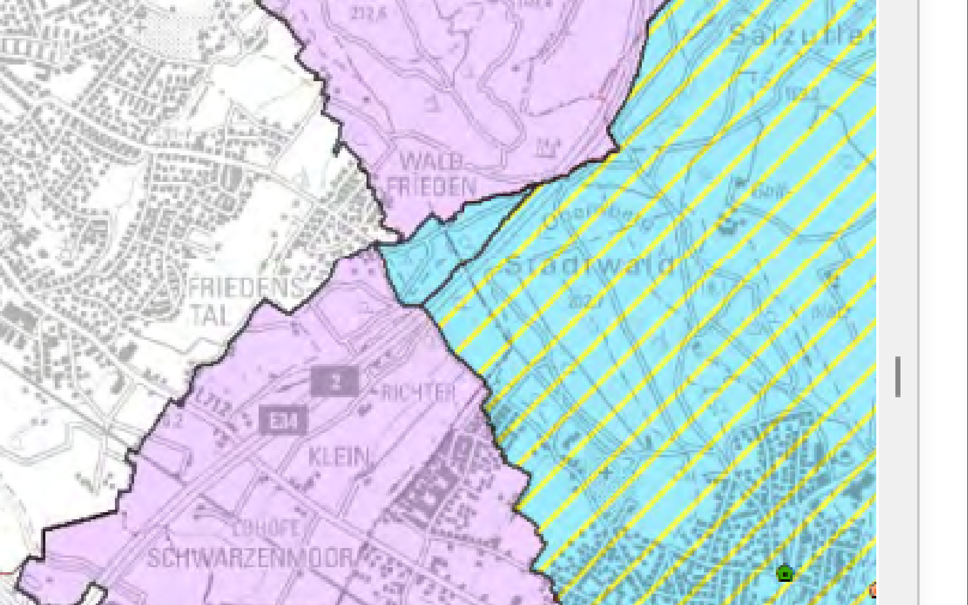 Auszug aus der Festlegung des Heilquellenschutzgebiets Bad Salzuflen. Die gelb gestreifte Fläche gehört zur Schutzzone A und soll gemieden werden. Quelle. Durchquerung des Obernbergs